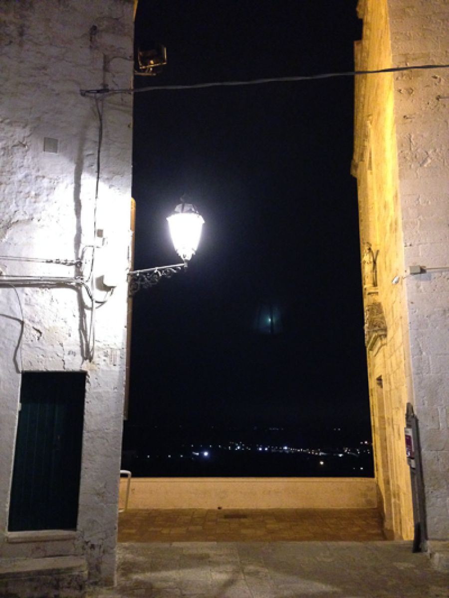 Abends – wenn die Stadt illuminiert wird – strahlt Ostuni eine fast magische Atmosphäre aus. Sie erinnert dann an eine maurische Festung und bietet eine perfekte Filmkulisse. Die romantische Stadtbeleuchtung und die angenehmen Abend-Temperaturen locken dann Einheimische und Touristen hinaus - in die zahlreichen Cafés, Restaurants oder Bars in den verwinkelten Gassen der Altstadt oder auf die zentrale „Piazza della Libertà“. Von dort aus sowie von vielen Plätzen der Altstadt haben Sie einen freien Blick über weitläufige Olivenhaine bis zum dahinter liegenden Meer – traumhafte Aussichten! Der Weg hinauf zur beleuchteten Kathedrale ist tagsüber wie abends eine bunte Flaniermeile, auf der Sie Kunsthandwerk, kleine Boutiquen, Spezialitäten aus der Region sowie Souvenirläden finden. Sie werden in einer der vielen Alstadt-Gässchen Ihr ganz persönliches Lieblingsrestaurant finden, in dem Sie den Abend stilvoll mit einem Glas Wein und kulinarischen Köstlichkeiten aus der apulischen Küche ausklingen lassen können….und vielleicht hören Sie aus der Ferne Musik - von einer spontan stattfindenden salentinischen Pizzica, oder einem Live-Konzert im Freien unterhalb der Stadtmauer. Das Leben kann so schön sein!